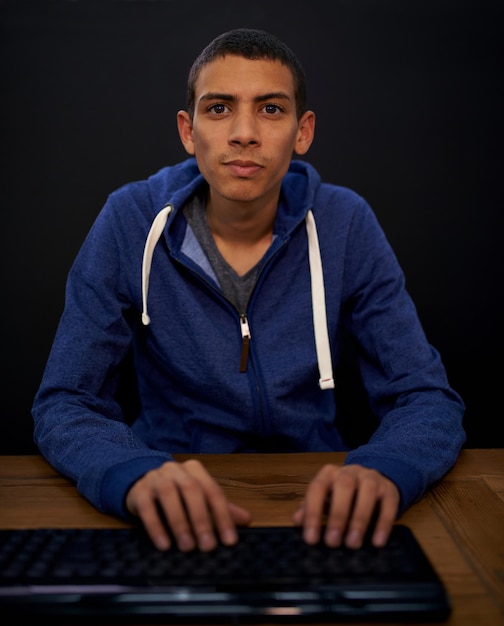 Koodausmuotokuva ja mies kirjoittaa pöydällä työskennellessään peliä varten. Musta tausta ohjelmointi ja online-kehitys kotona vakavana teknologian ja pov-näkökulmasta puistossa keskittyneelle miehelle