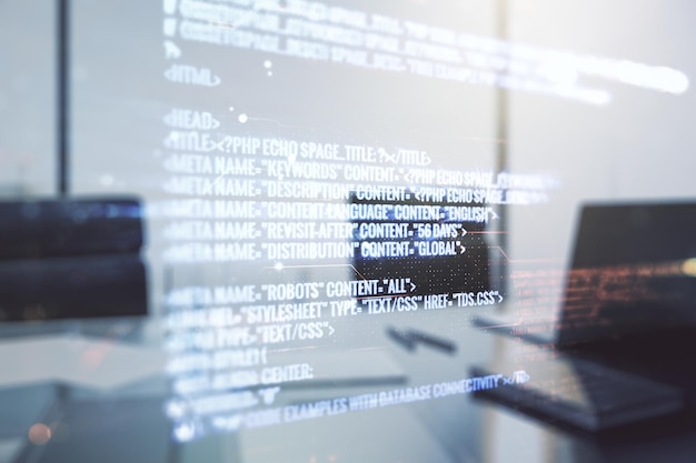 Monivalotus abstraktista luovasta koodausluonnoksesta modernilla kannettavan tietokoneen taustalla, tekoälyn ja hermoverkkojen konsepti